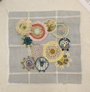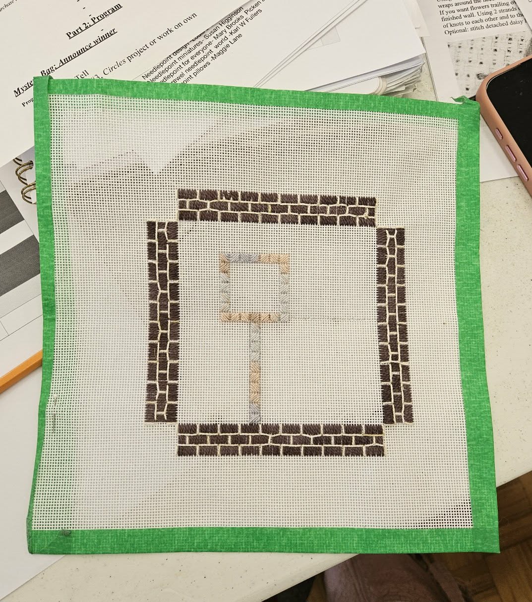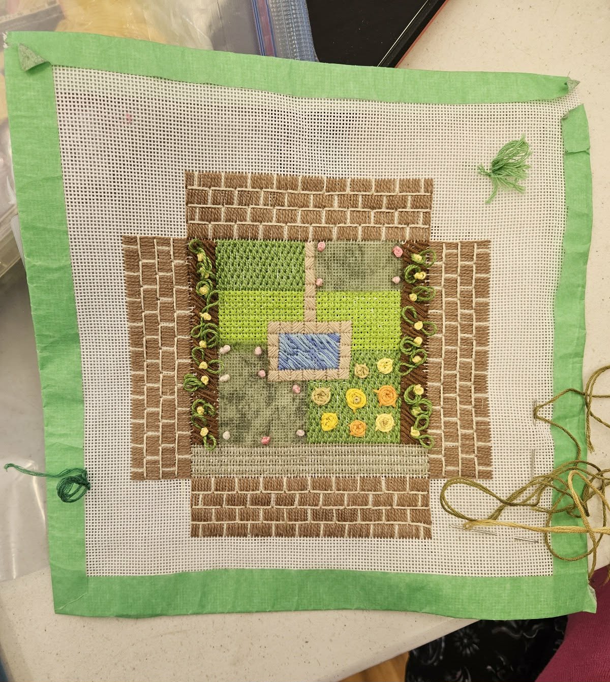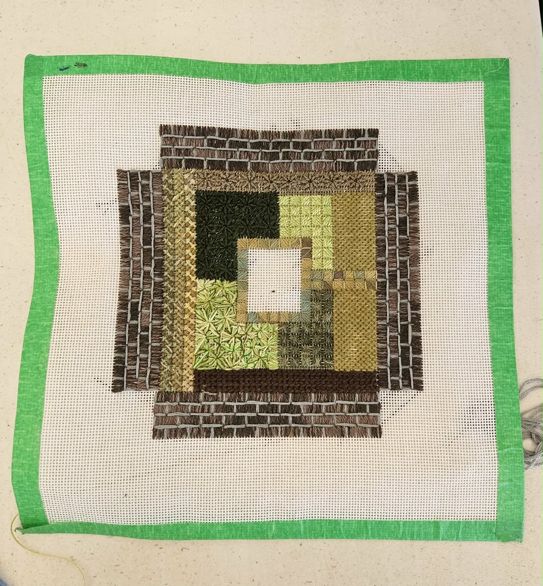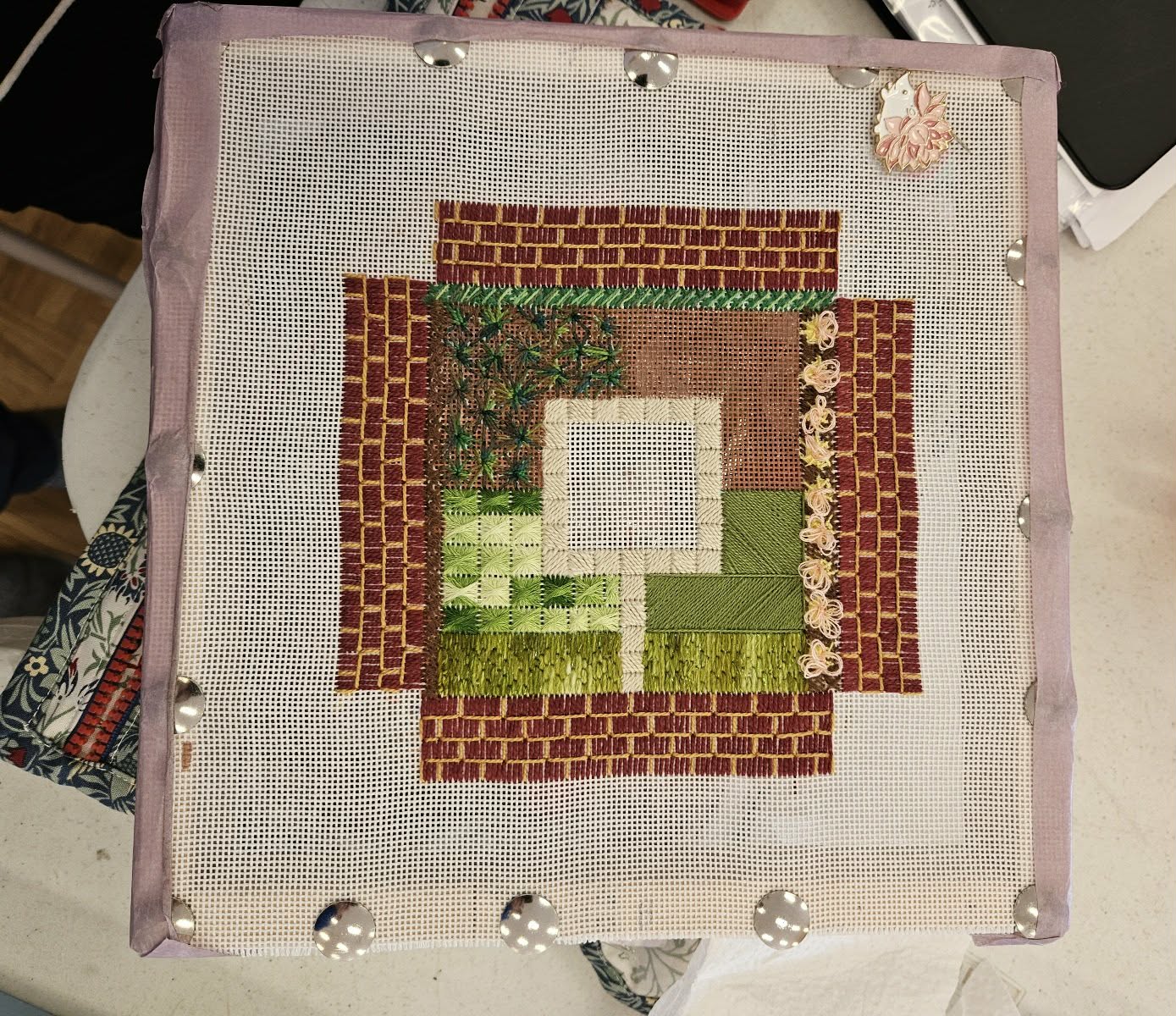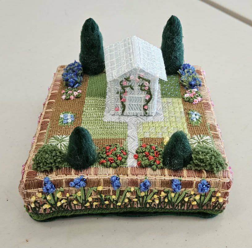 Pat - Completed "Knot Garden" project. Modifications to Olga's class project include adjustment of the scale of the wall perimeter using a cut-down canvas frame and adding felt trees