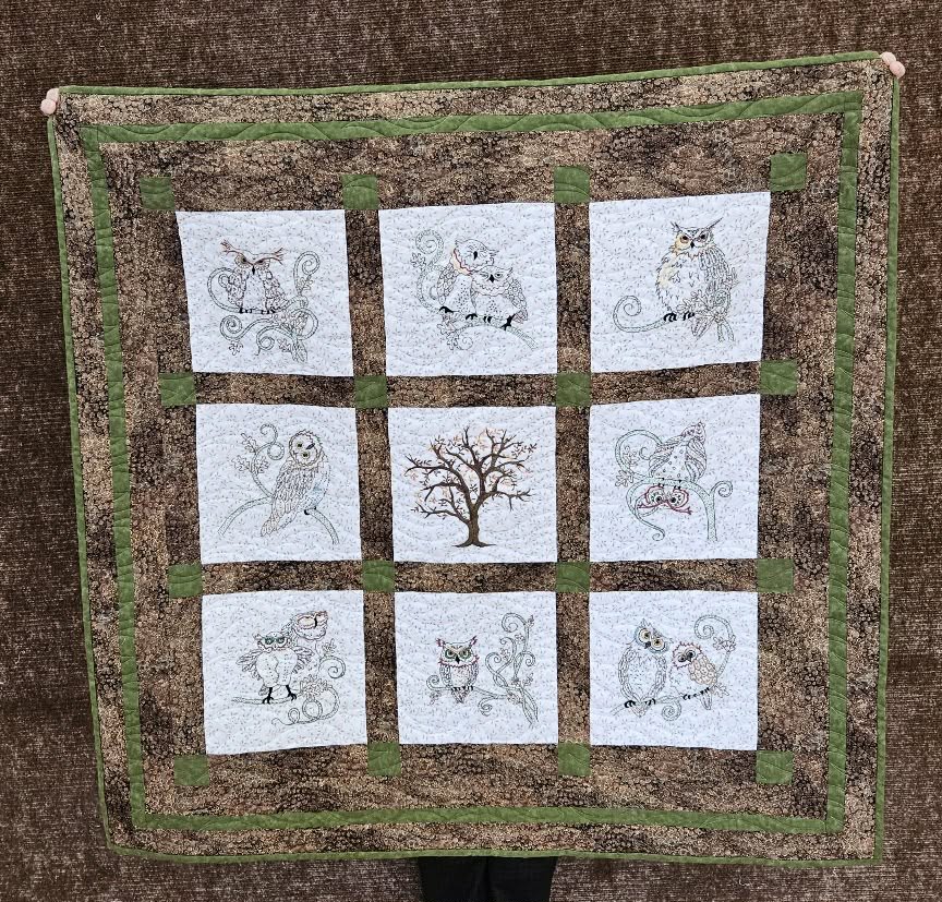 Norah - Embroidered Owl Quilt featuring a tree as the central motif